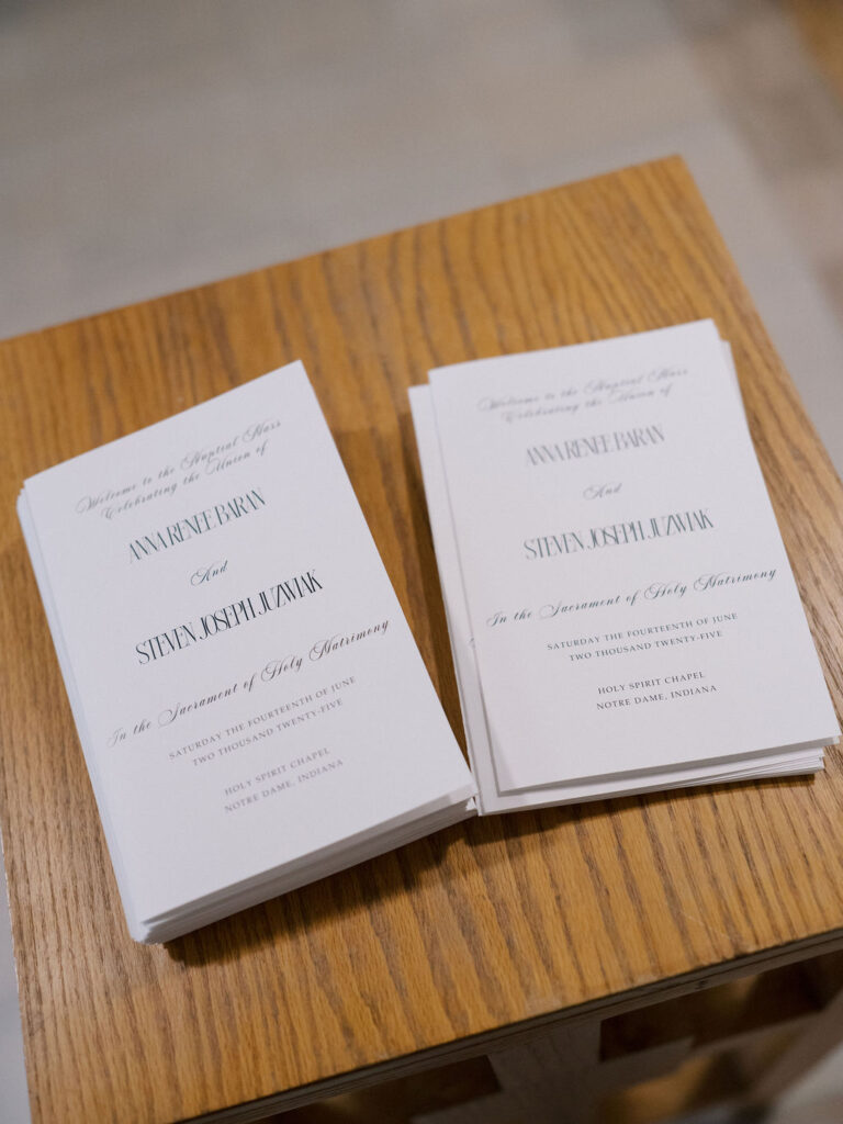 There’s something so beautiful about wedding ceremonies inside Holy Spirit Chapel. The soft glow from the stained glass, the vaulted dark wood ceilings, and the white marble altar make it one of my favorite spaces to photograph on the Saint Mary’s College campus. Anna and Steven’s Saint Mary’s Notre Dame wedding felt deeply reverent yet joy-filled—a blend of quiet emotion and celebration.